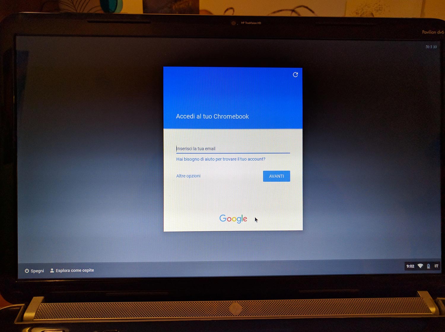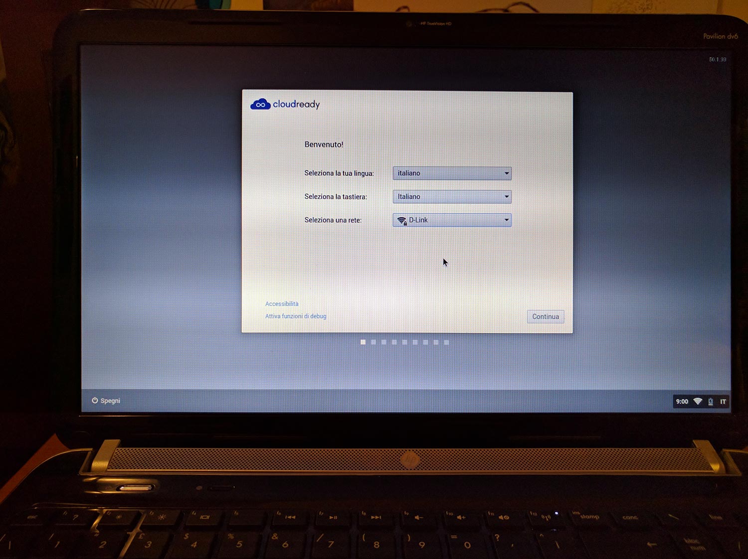 Se l’avvio tramite USB è impostato come prima opzione di boot, basterà collegare la penna al computer spento e poi avviarlo: vedremo subito comparire la schermata di CloudReady. In alternativa, sarà necessario premere un tasto speciale della tastiera per accedere all’opzione di avvio corretta (fate sempre riferimento al pdf con le istruzioni, il tasto speciale è diverso per ogni marca di computer).